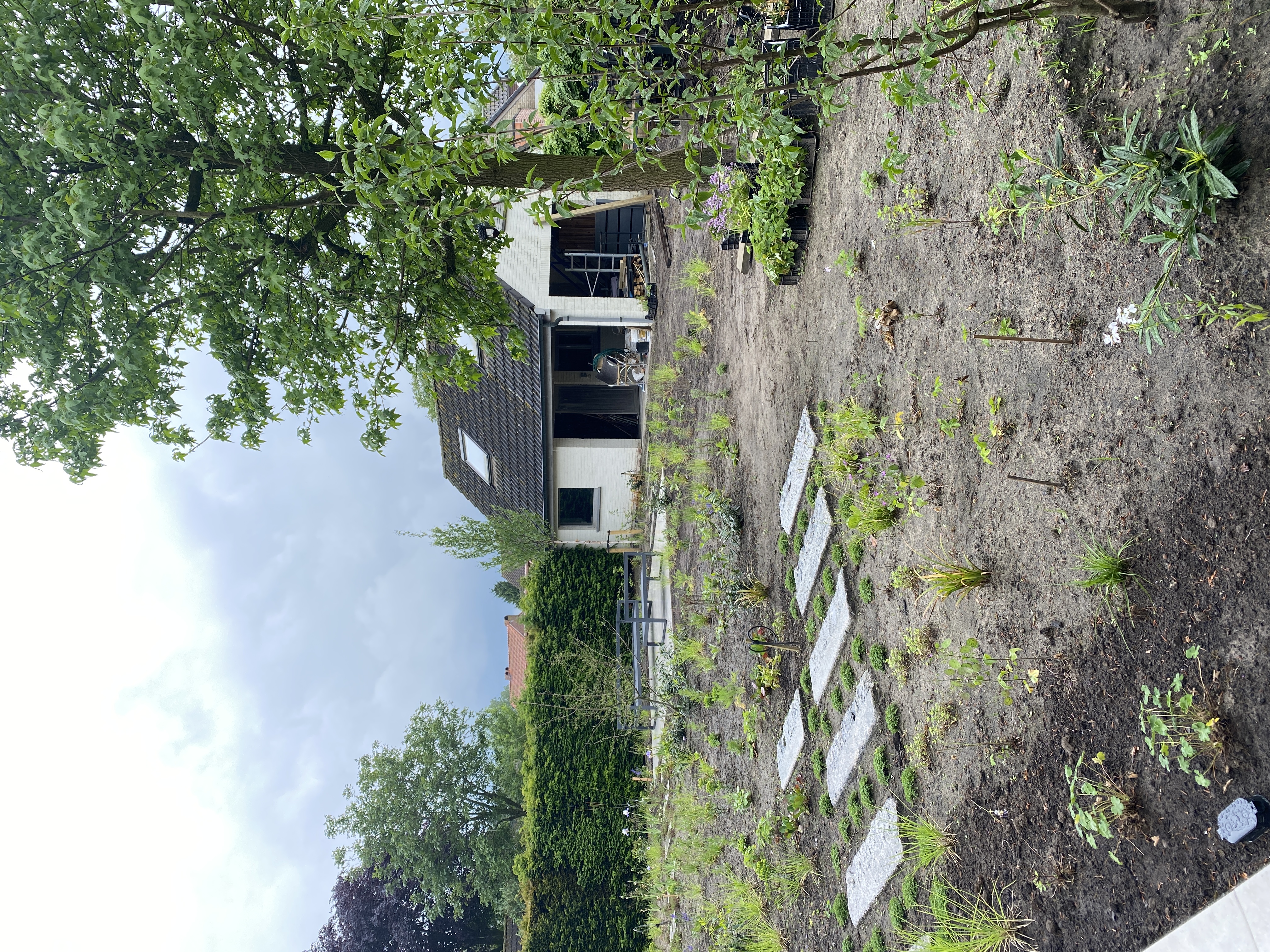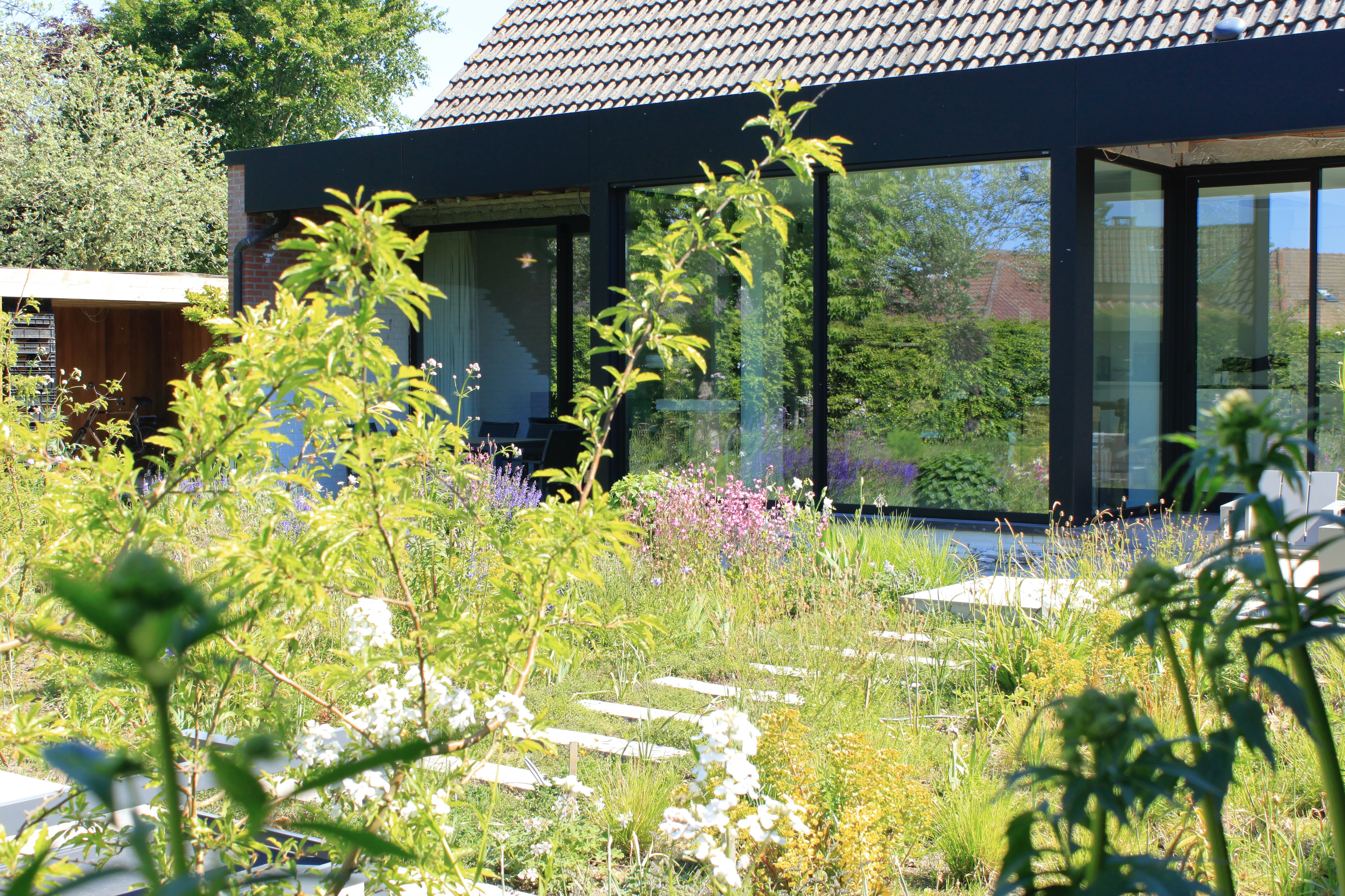 After renovating the inside of the house, the owners wanted to tackle their garden. Except for a few good sized trees, the planting in both front and back garden was old, in bad shape and everything but biodivers. The garden also came with a huge pool which they weren’t sure about keeping.