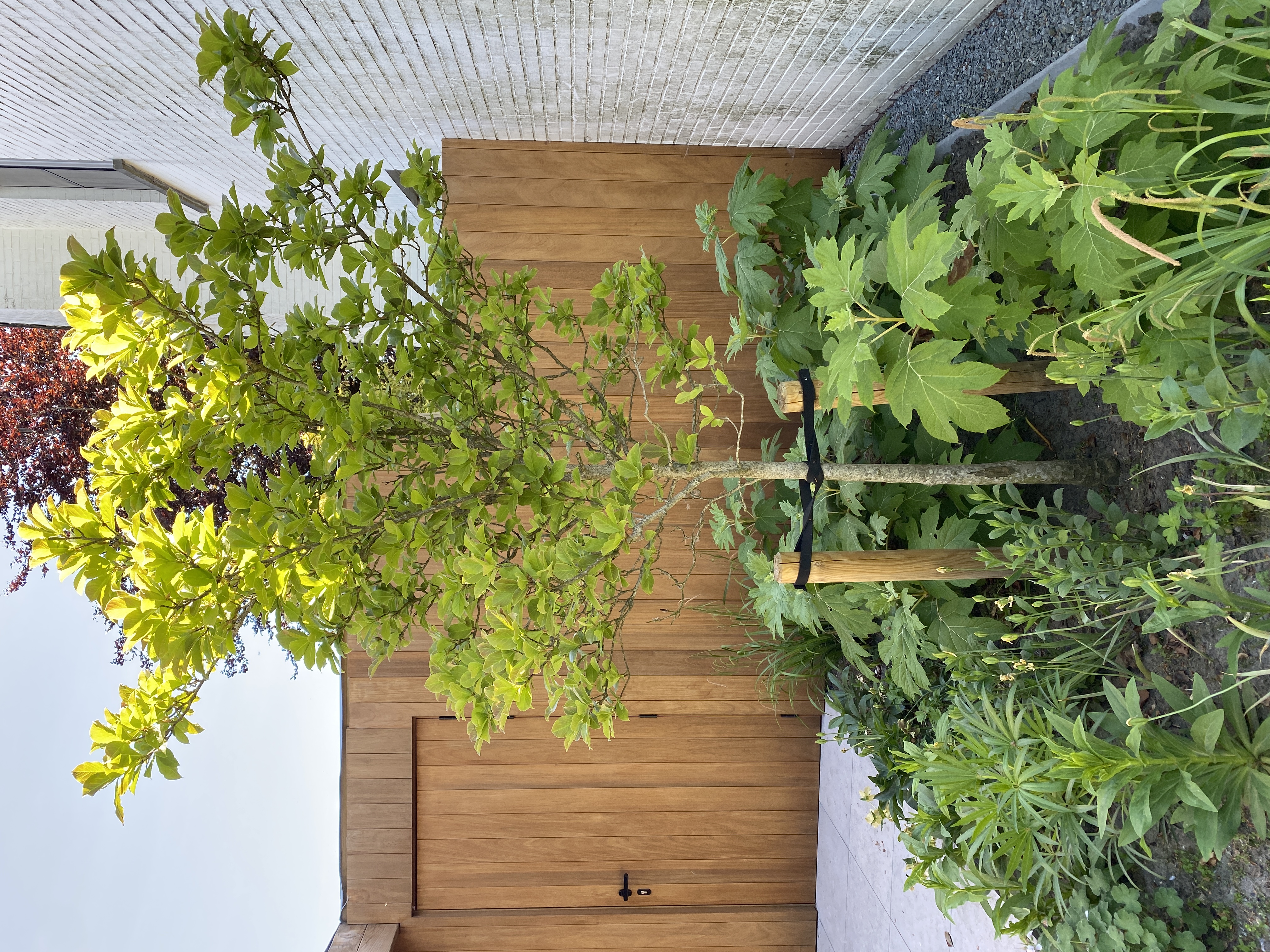 The pool is replaced with a terrace in the sun. Surrounded by 2 multistemmed Malus toringo ‘Brouwers Beauty’ and a high stemmed Betula utilis ‘Fascination’, they will create height in the future and seasonal interest with their blossom and fall colours.