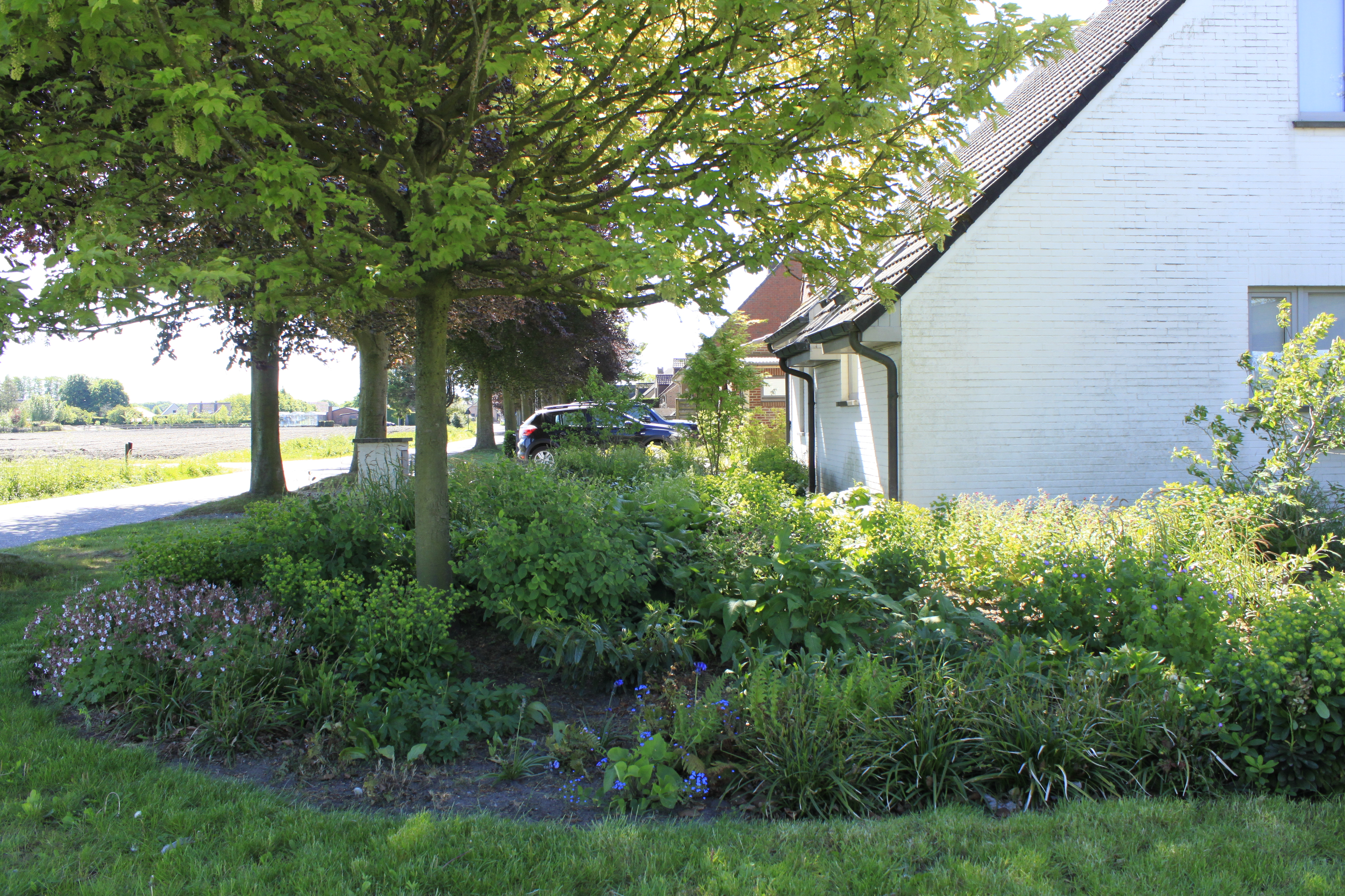 The front garden is now a mix of perennials, shrubs and trees with 70% evergreens for that winter silhouette but with enough variation to have some interest from spring till fall. Once fully grown it will require minimal maintenance.
